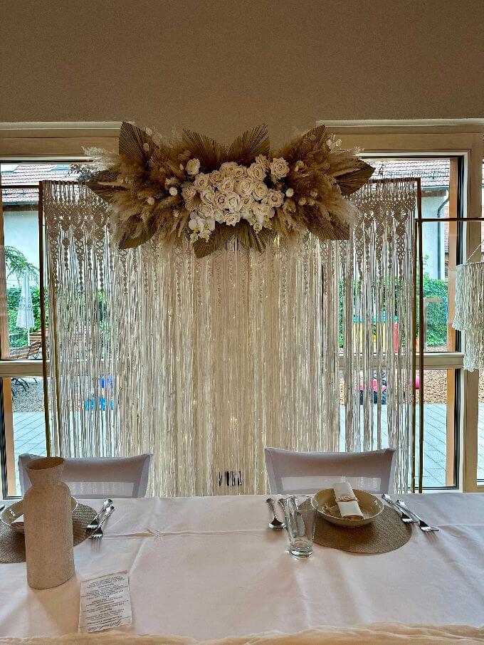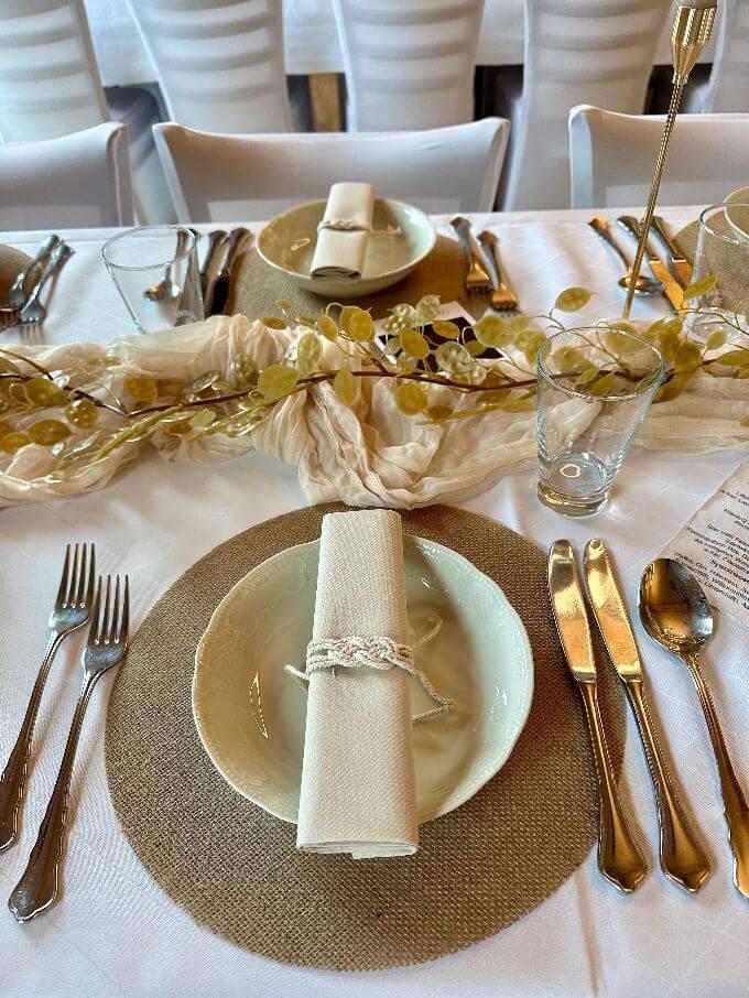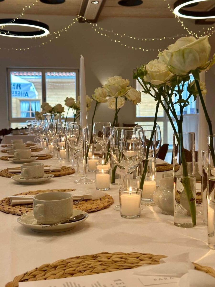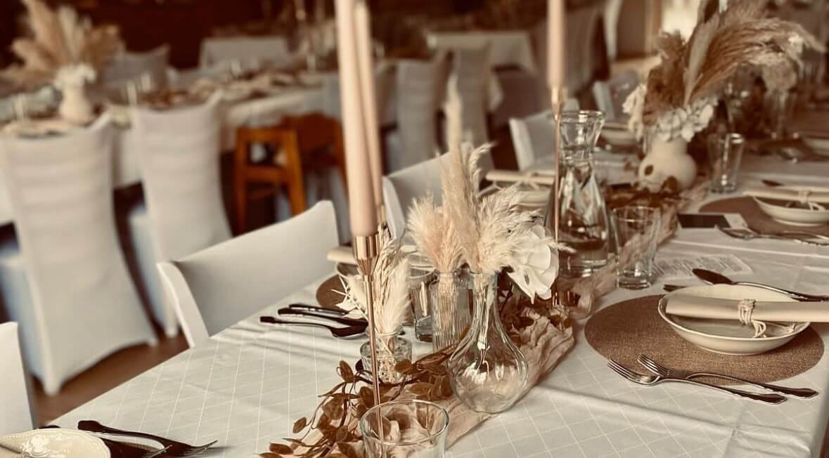 Die Dekorationen werden pro Person berechnet. Dies beinhaltet: Tischwäsche in creme und weiß, Servietten, Kerzen und Tischbänder in verschiedenen Farben.