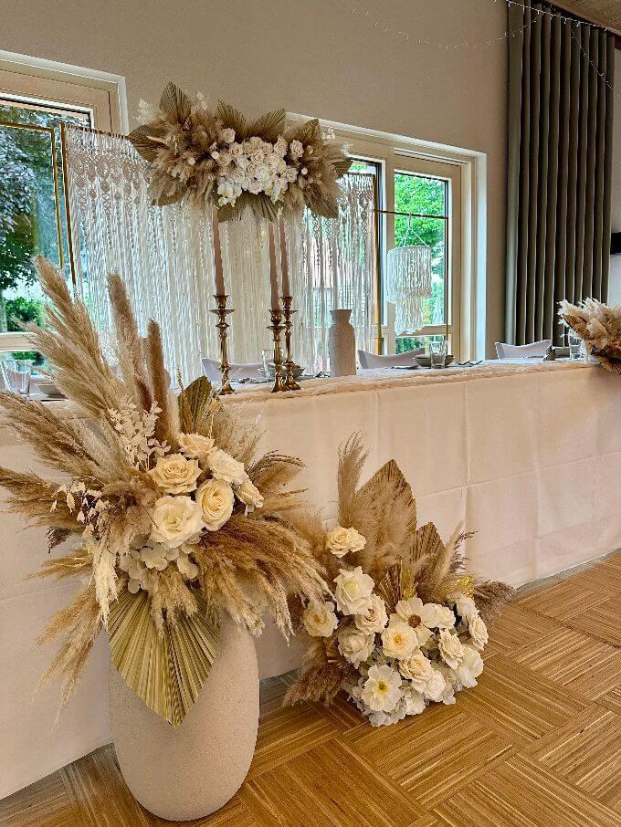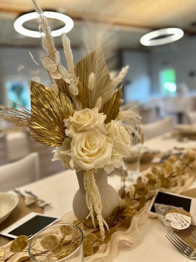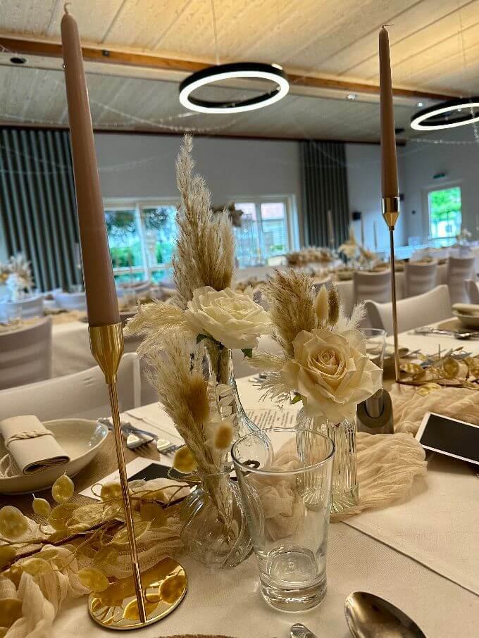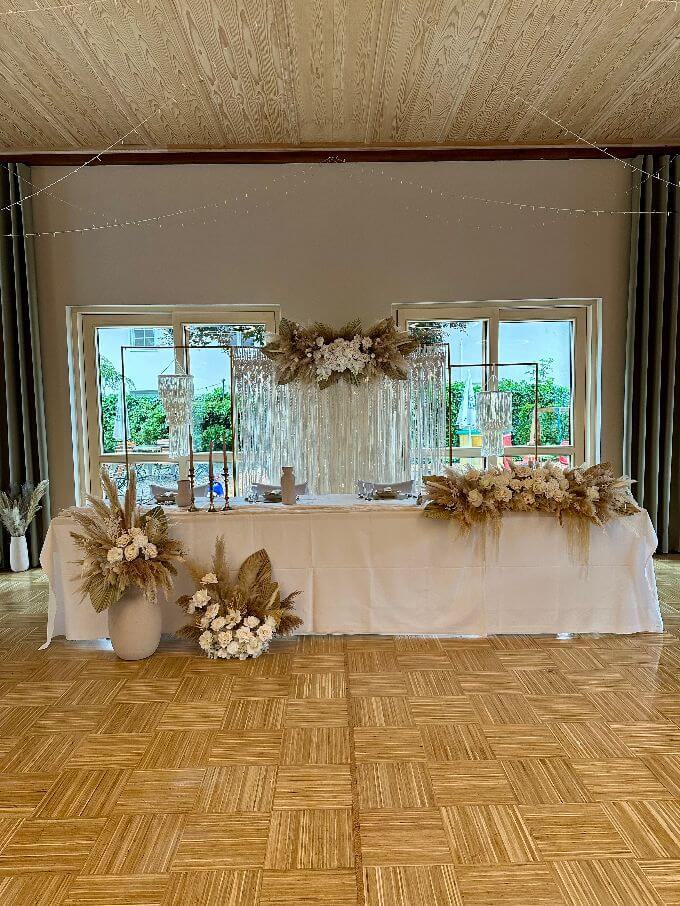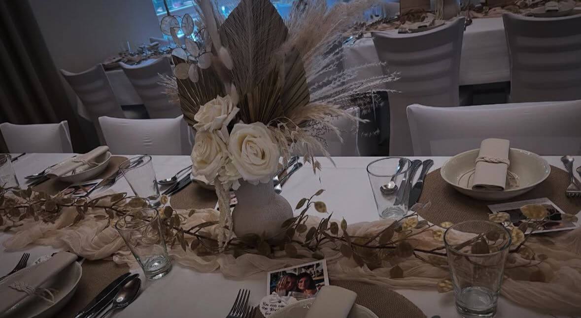Die Dekorationen werden pro Person berechnet. Dies beinhaltet: Tischwäsche in creme und weiß, Servietten, Kerzen und Tischbänder in verschiedenen Farben.
